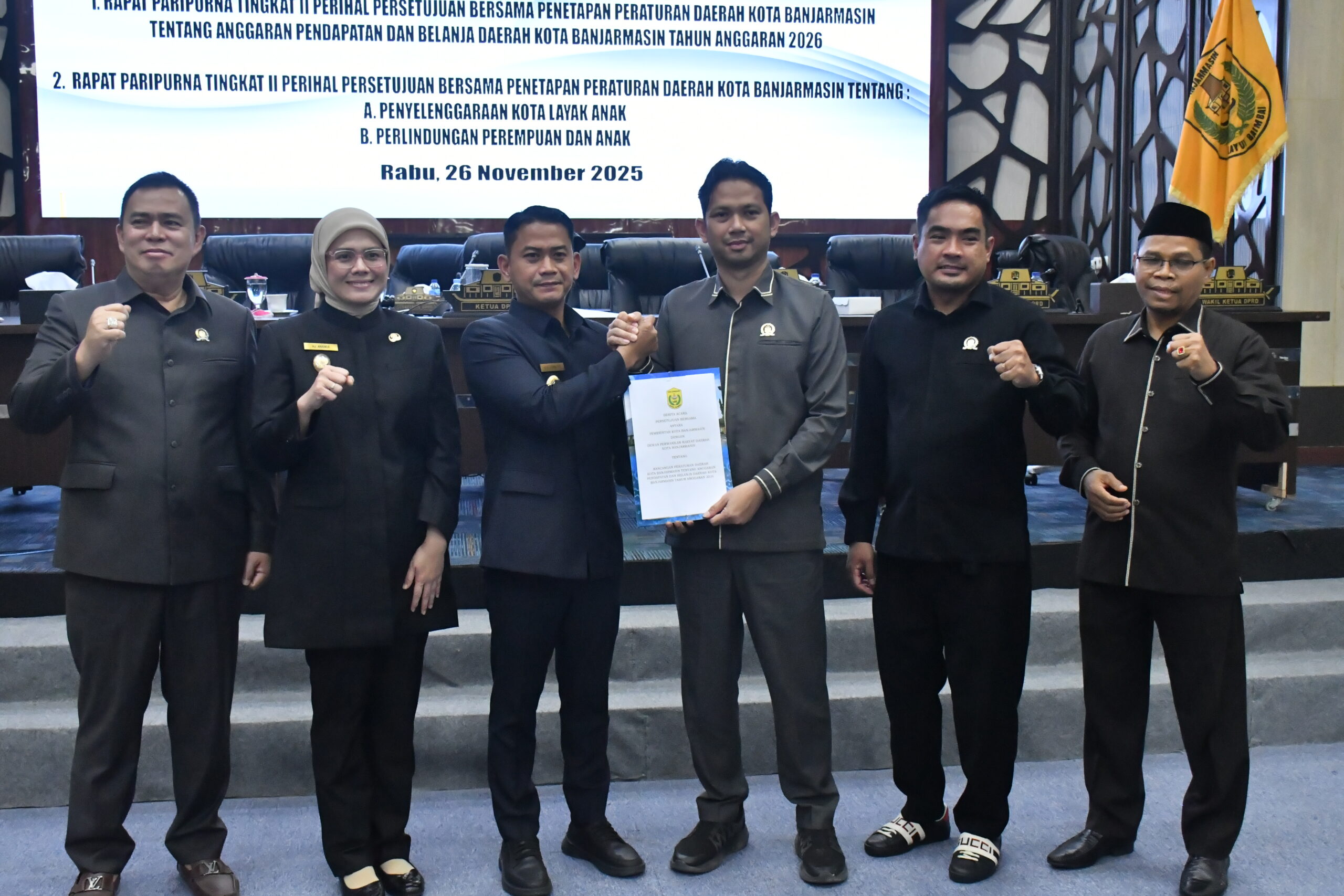 Dalam sidang paripurna itu juga diagendakan persetujuan bersama penetapan Perda Kota Banjarmasin tentang Penyelenggaraan Kota Layak Anak serta Perlindungan Perempuan dan Anak yang turut ditandatangani Wakil Wali Kota, Hj. Ananda, bersama jajaran Wakil Ketua DPRD Harry Wijaya, Mathari, dan M. Isnaini.