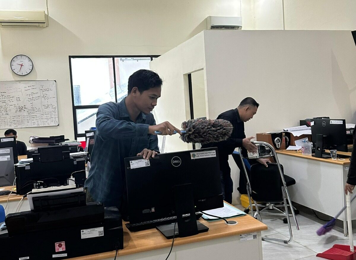 kalsel.radigfamedia.com, Barabai — Dalam rangka mendukung Gerakan Nasional Indonesia ASRI Peduli Kebersihan Lingkungan Kerja sebagaimana tertuang dalam Surat Sekretaris Jenderal Kementerian Agraria dan Tata Ruang/Badan Pertanahan Nasional Nomor B/PL.01/270-100/III/2026 tanggal 3 Maret 2026, Kantor Pertanahan Kabupaten Hulu Sungai Tengah melaksanakan kegiatan kurvei (kerja bakti) bersih lingkungan kantor pada Jum’at, 06 Maret 2026.