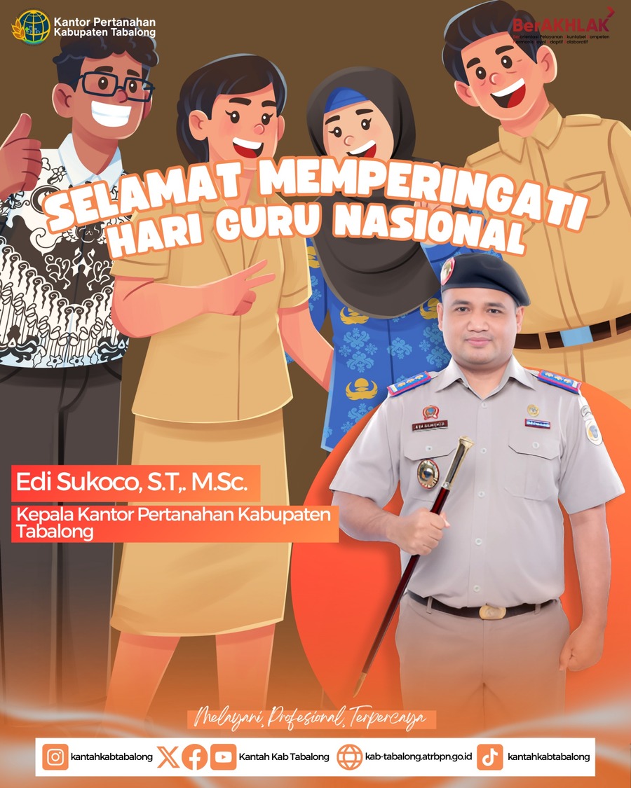 Kalsel.Radigfamedia.com, Tabalong – Kepala Kantor Pertanahan Kabupaten Tabalong, Bapak Edi Sukoco, S.T., M.Sc., beserta seluruh jajaran, mengucapkan Selamat Memperingati Hari Guru Nasional.