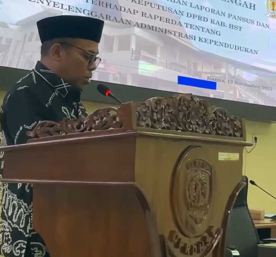 Kalsel.Radigfamedia.com, Hulu Sungai Tengah – Wakil Bupati Hulu Sungai Tengah (HST) Gusti Rosyadi Elmi menghadiri Rapat Paripurna DPRD Kabupaten HST dengan agenda penyampaian laporan Panitia Khusus (Pansus) dan pengambilan keputusan terhadap Rancangan Peraturan Daerah (Raperda) tentang Penyelenggaraan Administrasi Kependudukan, Kamis (13/11/2025) di Gedung DPRD HST, Barabai.